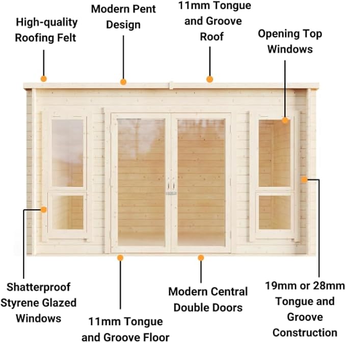 • Pent Design - The pent roof of this garden room makes it a stylish addition to any garden while offering excellent head height and versatile use options without taking up too much valuable garden space.